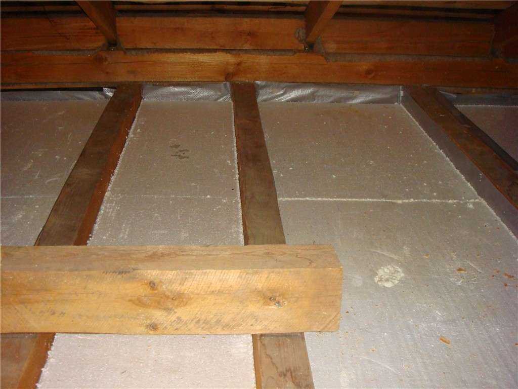 - На нее укладывается утеплитель, на него — гидроизоляционная пленка. Стыки проклеиваются.