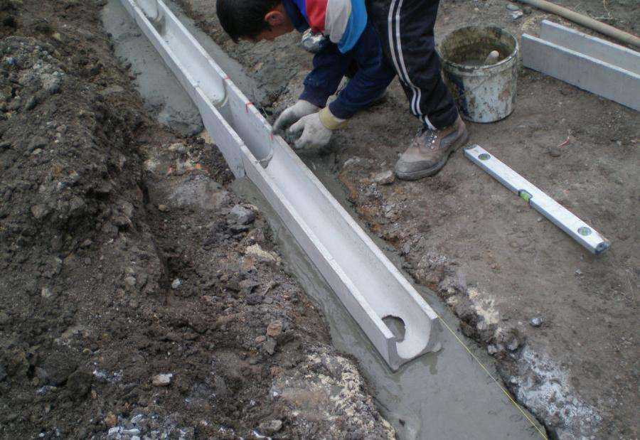 - В центре траншеи устанавливают лоток, а чтобы удалять остатки бетона было легче, по окончании накрывают пленкой из полиэтилена.