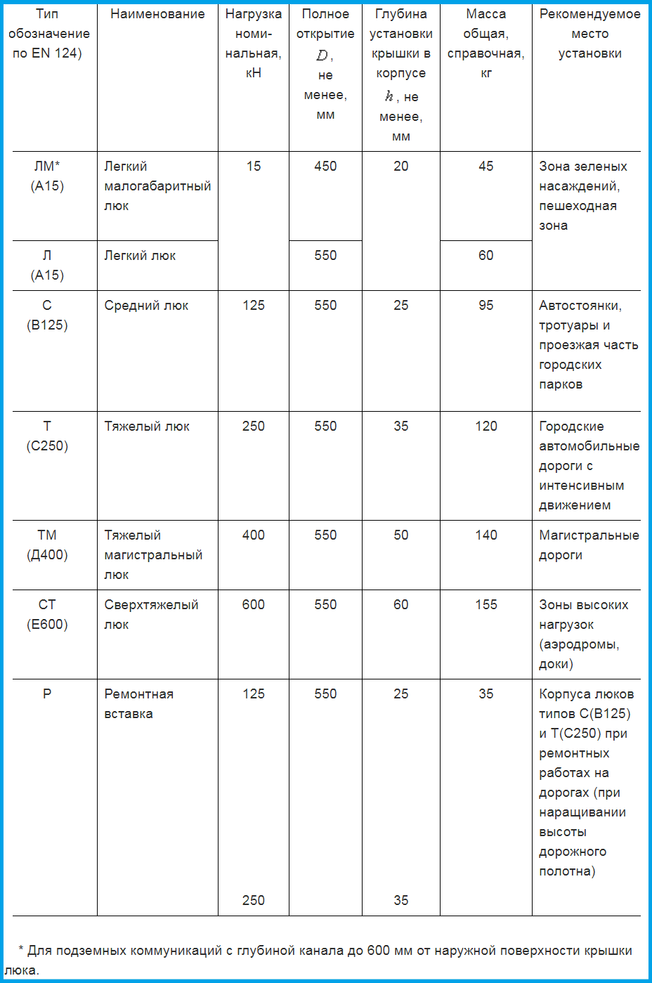 - Тяжёлый люк. Тип – Т. Максимальная нагрузка – 25 тонн. Данные тяжёлые люки устанавливают на всех инженерных коммуникациях и городских дорогах.