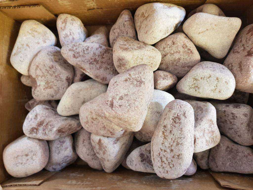 Лучше всего брать уже готовый расфасованный кварцит. Колотые камни для бани могут иметь дефекты, обусловленные процессом производства. Поэтому перед засыпкой в каменку необходимо тщательно перебрать материал, убрать все экземпляры с трещинами и прожилками, иначе потом они могут расколоться. При постукивании молоточком по камню должен быть звонкий звук, если он глухой, то кусок имеет трещину и нужно его отбраковать.