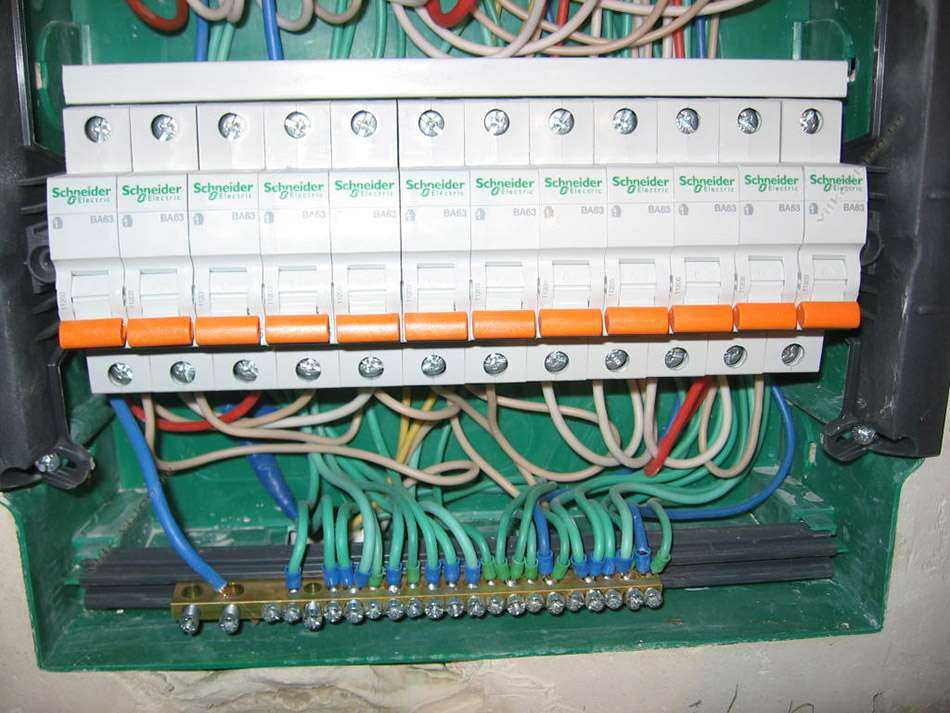 Если подключение трехпроводное, то заземляющие жилы аналогичным образом соединяются шинной колодкой. Однако следует учесть, что они не должны контактировать с нулем.