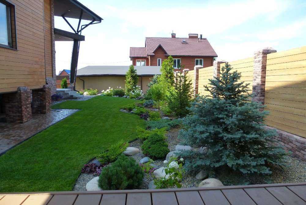 Заборы внутри участка допустимы, если на большой территории есть необходимость зонирования. Для этой цели подойдет живая изгородь. Внешние ограждения делают из труб, профнастила, сетчатых конструкций с декоративным наполнителем.