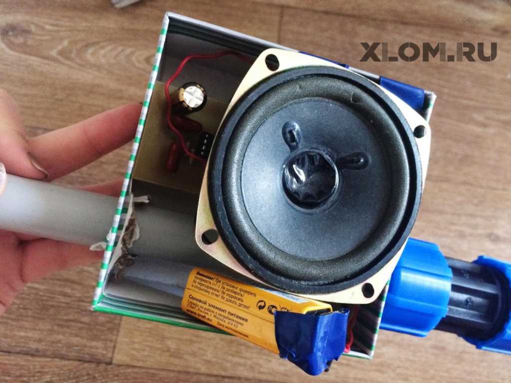Чтобы повысить уровень громкости и получить дополнительный индикатор, используются светодиоды VD1. Рекомендуется подобрать их с таким расчетом, чтобы не перегорели динамики, и установить на штанге для включения кнопку.