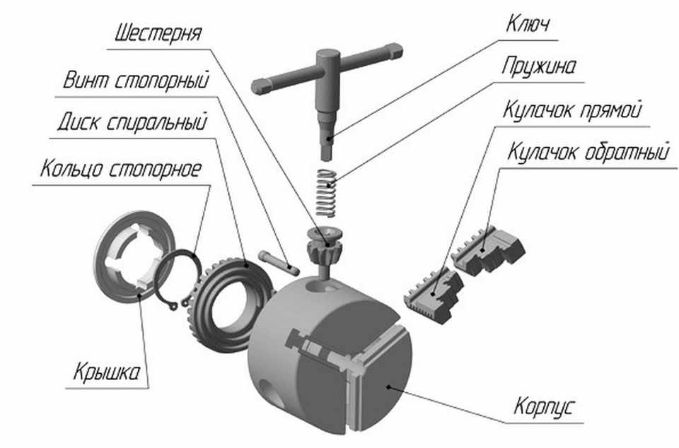 Рис.3 — Конструкция спирально-реечного токарного патрона.
