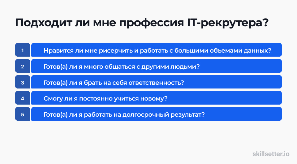 Прежде чем попробовать свои силы в IT-рекрутинге, проверьте, подойдет ли вам это направление. Далее идут вопросы, которые помогут понять, сможете ли вы реализовать свой потенциал, став IT-рекрутером.