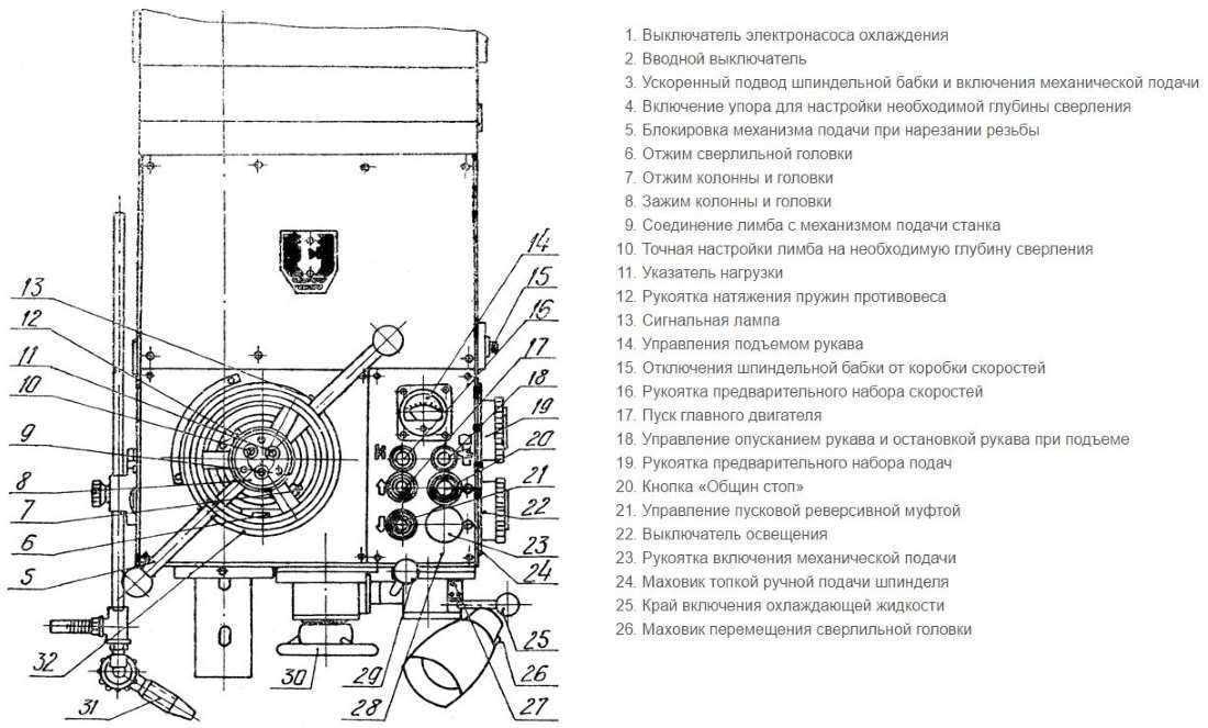 Наличие в станке преселективного управления скоростями и подачами, легкого гидрофицированного управления фрикционом шпинделя, возможность отключения шпинделя от коробки скоростей, наличие надежных гидравлических зажимов колонны и сверлильной головки, работающих как совместно, так и раздельно, а также сосредоточение всех органов управления на небольшом участке сверлильной головки позволяет максимально сократить вспомогательное время.