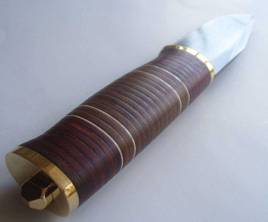 Проще всего изготовить рукоятку из дерева. Если хвостовик лезвия вытянутой формы, изготовление ручки не займет много времени. Достаточно просто найти брусок подходящей длины, высверлить в нем отверстие нужного диаметра и обстрогать брусок в форме рукоятки. Клинок закрепляют в рукоятке с помощью эпоксидной смолы.