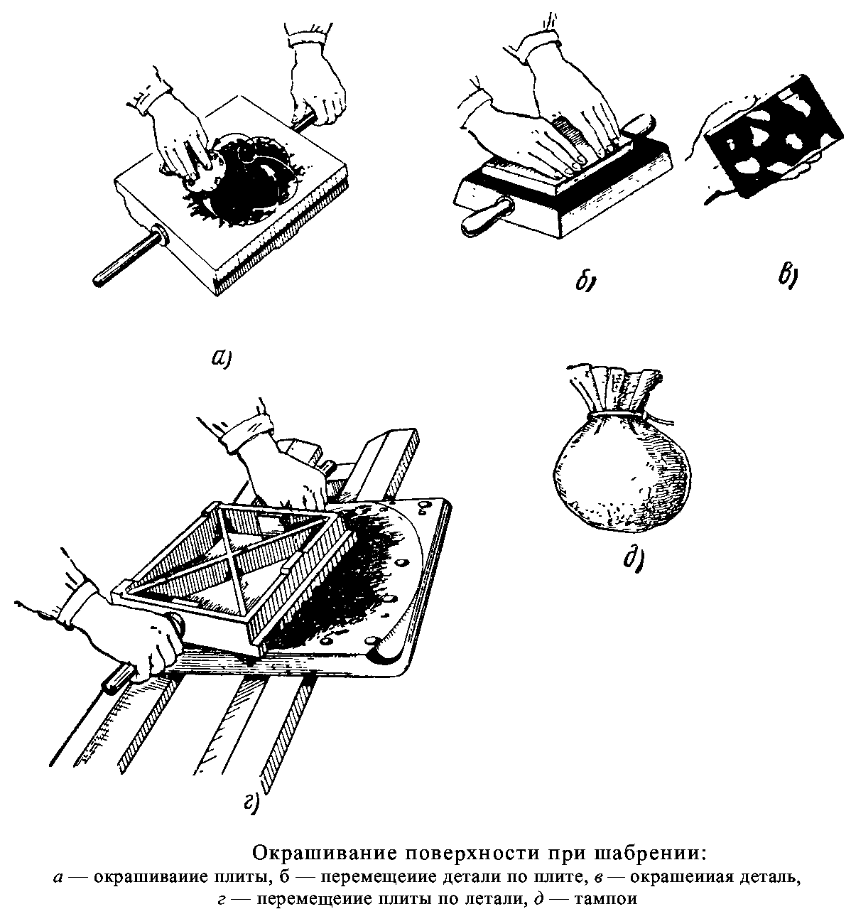 Полученной смесью окрашивают обрабатываемую плоскость. Для растирания шабровочной краски используют тканевый тампон или резиновый валик для малярных работ.