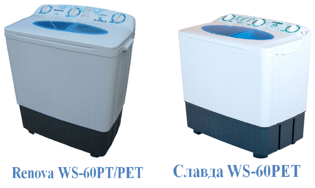 - Renova WS-60PT/PET. Еще один представитель семейства полуавтоматических машинок с двумя отсеками. Внешне эти машины ничем не примечательны, но сколько, вы думаете, они вмещают белья? Аж 6 кг для стирки и 2,5 для отжима, при этом отжим осуществляется на скорости 1350 оборотов. Работает такое «чудо-техники» без отказов много лет, поскольку устроено очень просто.