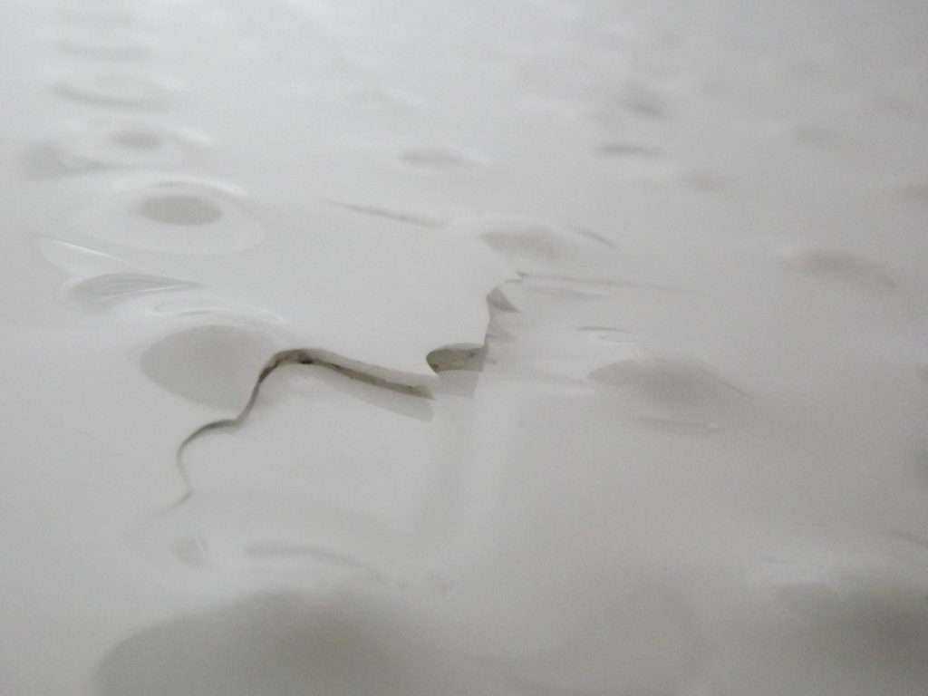 - Падение тяжелых предметов. Удар тяжелым предметом является основной причиной сколов эмали. Акриловая ванна изготовлена из сплошного материала, поэтому на ней не образуется сколов, но могут появиться деформации и глубокие царапины. Если поверхность соприкосновения небольшая (например, как при падении утюга на носик), то в чаше может образоваться сквозное отверстие. Тонкие акриловые вкладыши, которые применяются при ремонте чугунных и стальных ванн, часто трескаются при сильных ударах.