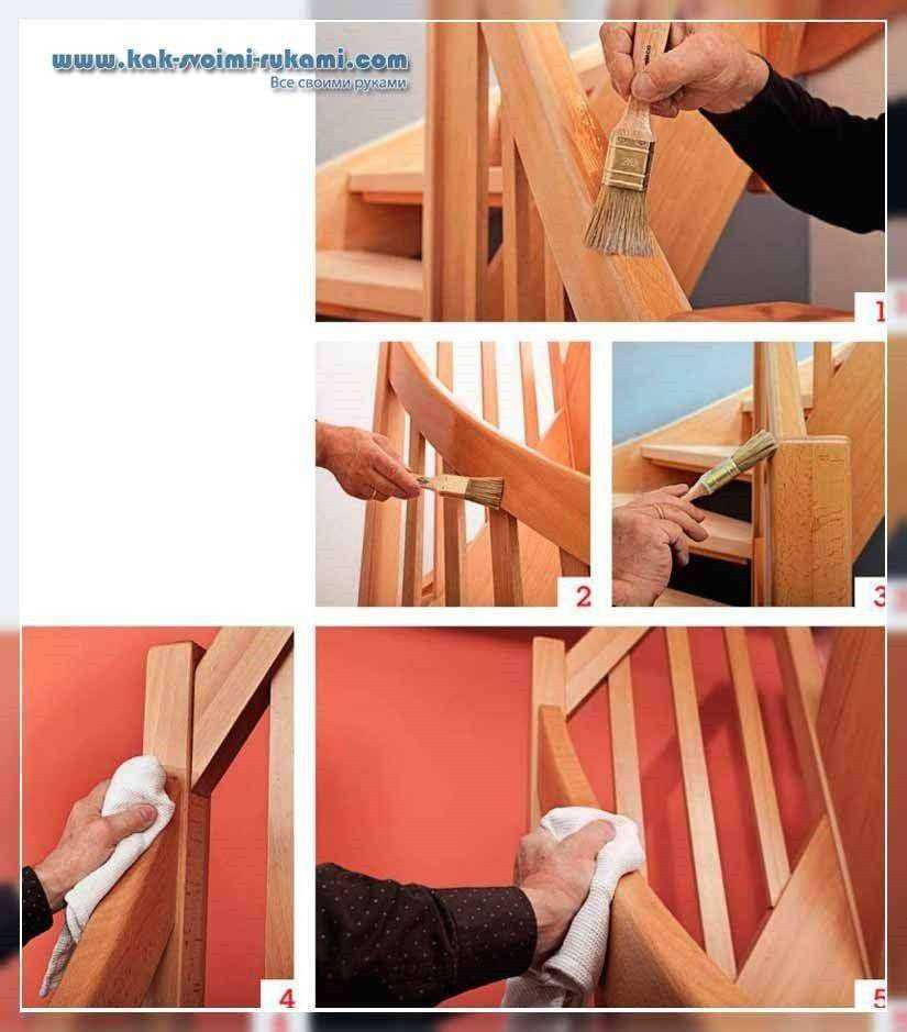 Прежде чем выполнить отделку внутренней деревянной лестницы паркетным лаком, нужно подготовить валик и кисточку. Первым слоем нужно нанести состав на всю поверхность, в том числе, на торцы, шипы и тыльную сторону панелей. Если вы хотите тонировать перила, то после нанесения тонировки следует покрыть поверхность лаком и зашлифовать её. Количество слоев покрытия вы регулируете самостоятельно.