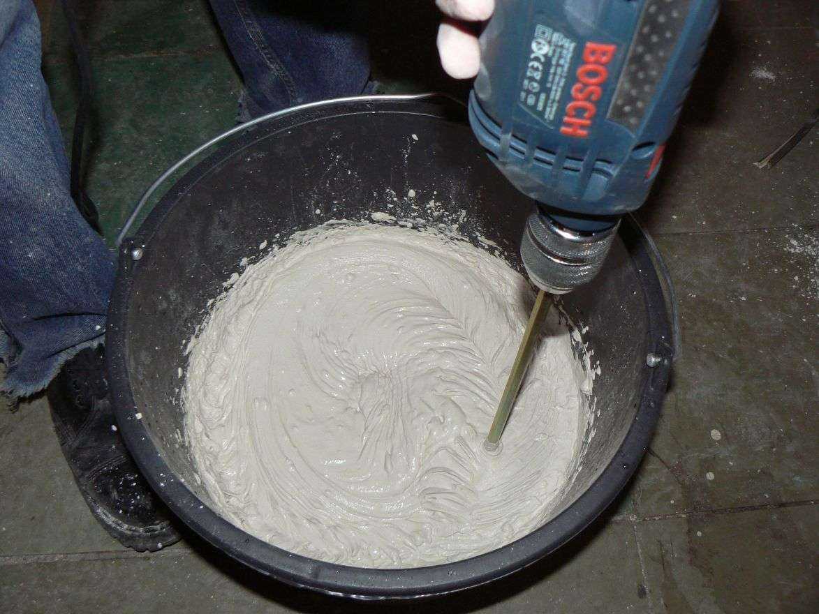 - Быстрым выверенным движением с помощью насадки на дрели производят замес в течение 2 мин. (дрель предпочтительнее, однако вручную также допускается).