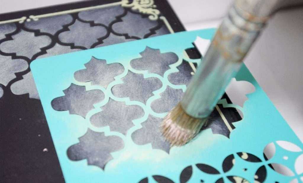 В качестве красителя используют пасту или краску. Красящий состав проникает через прорези, окрашивая поверхность. Самыми популярными и востребованными считаются универсальные модели. Они используются не только для раскрашивания стен, но и в техниках декупажа, скрапбукинга, украшения альбомов и картинок, мебели и предметов интерьера. Через шаблон наносится не только краска, но и клей. Полученный оттиск украшается пудрой для эмбоссинга или глиттером.