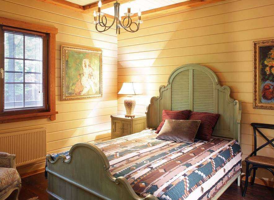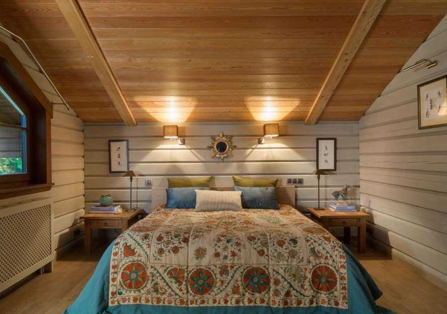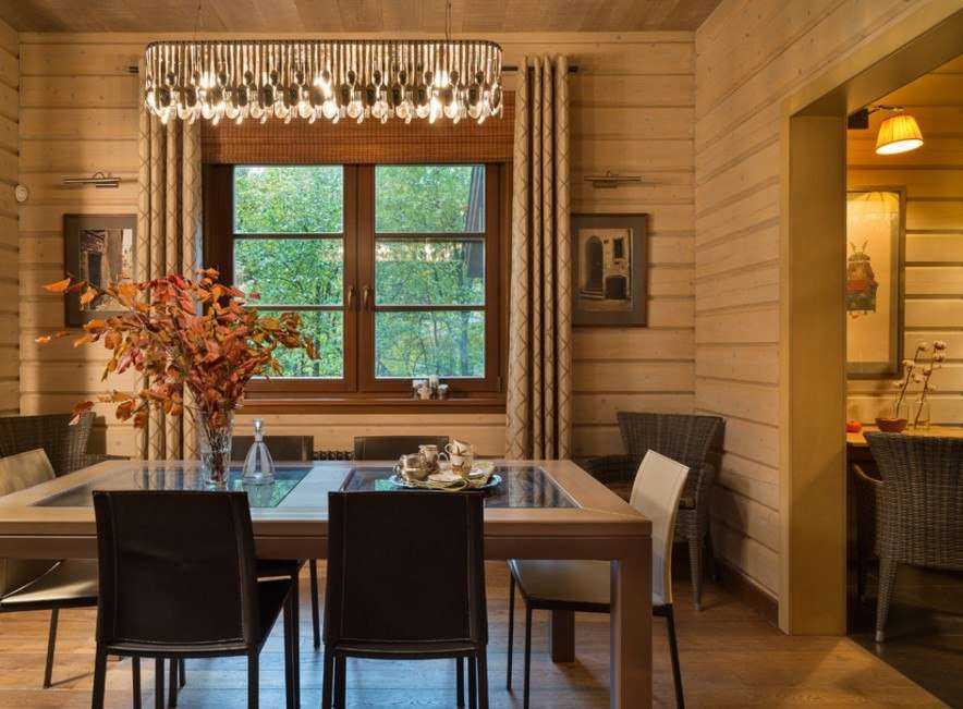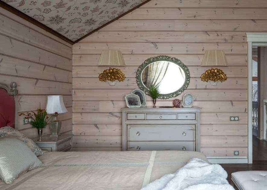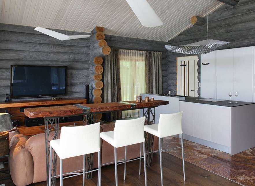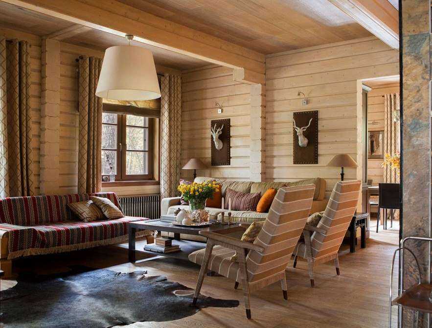 Стены штукатурят или обкладывают деревянными обоями на основе шпона или термодерева, вагонкой или блок-хаусом. Часто только одну стену покрывают полностью досками, которые размещены горизонтально. Для интерьера выбирают светлые тона. Массивные деревянные балки в квартирах с потолками высотой 2,5 м не устанавливают, поскольку конструкция визуально уменьшит пространство. В хрущевках их можно заменить досками или деревянными рейками.