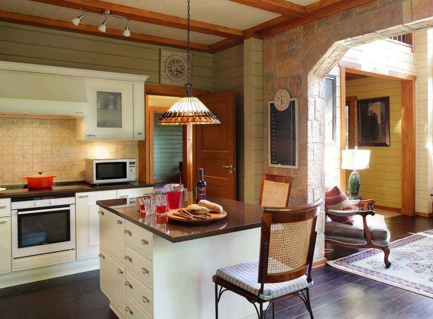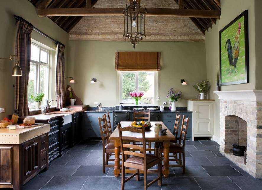 - на стенах — деревянные панели, у очага или плиты — камень или кирпич;