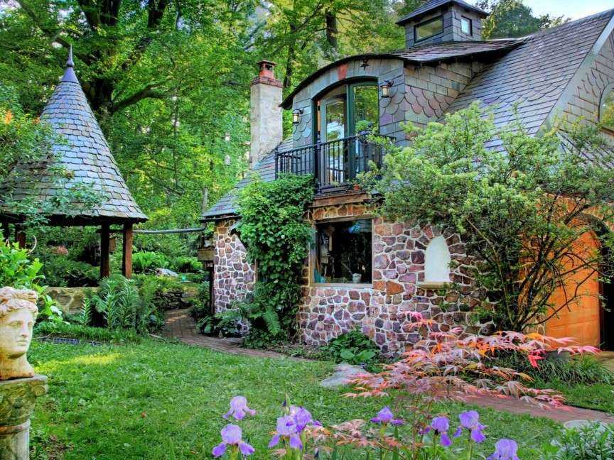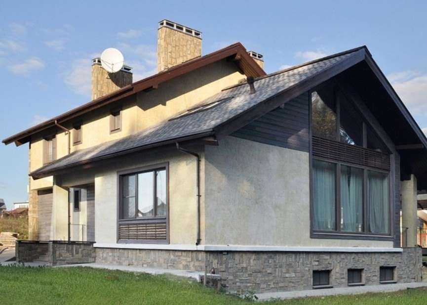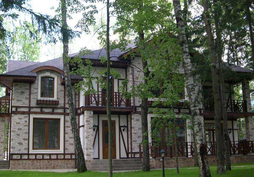 - отделка — штукатурка фактурного типа со вставками из камня или дерева;