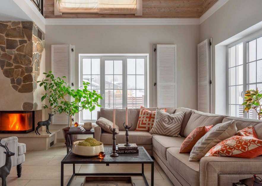 В гостиной чаще всего монтируется камин или электрокамин, который отделывают камнем или штукатурят, а затем красят. Возле камина сосредотачивается мягкая мебель — один или несколько диванчиков, мягкие кресла или кресло-качалка, пуфы. Для них выбирается обивка из кожи или текстиля высокого качества в бежево-коричневых, серых или чёрных тонах. На диване располагают большое количество декоративных подушек различных цветов или с клетчатым принтом.