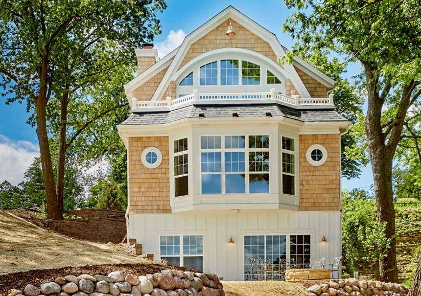 Современные дизайнеры и архитекторы любят проектировать загородные дома в стиле шале, потому как их легко вписать в любой ландшафт. Главная отличительная черта стиля – края крыши, которые нависают над массивными окнами. При этом оконные проемы обязательно должны быть большими, чтобы пропускать максимальное количество солнечного света. Обязательным атрибутом интерьера считался камин из натурального камня, который создавал в доме атмосферу теплоты.