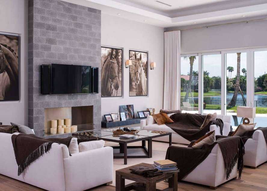 Интересная идея: поместить плоский экран телевизора над камином. Это позволит попеременно любоваться языками пламени и любимыми передачами. Для того, чтобы иметь возможность скрыть экран, на стенку вешают раздвигающиеся занавеси из тканей скромных расцветок.