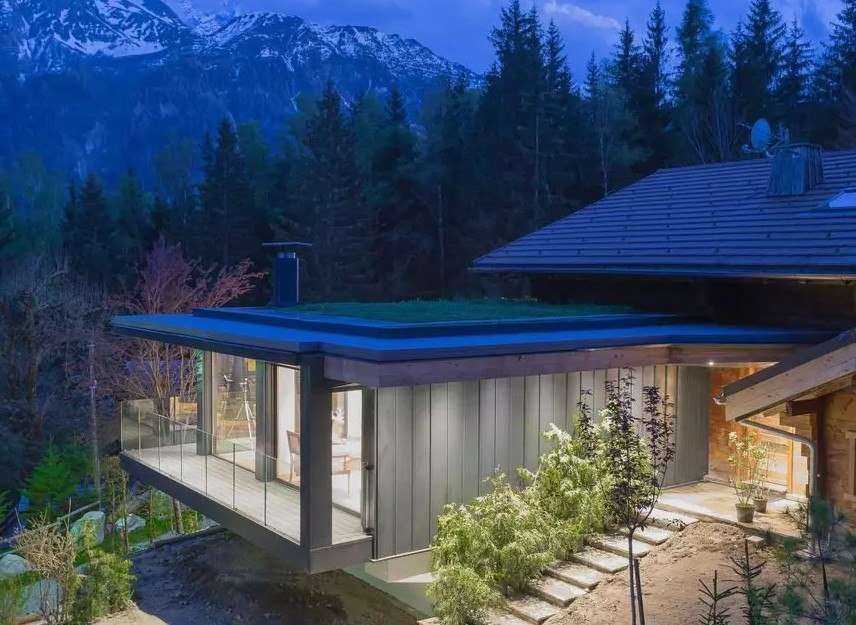 Шале 21-го века привносят романтичность в очень традиционной форме, подчеркивая монументальную крышу и богатую материальность древесины, белой штукатурки и бетонного интерьера, с этими бликами и открытым огнем.