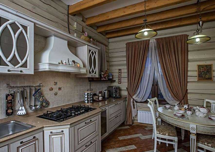 - кухонная гарнитура — лаконичных форм, добротная и надежная, по желанию ее можно украсить коваными элементами;